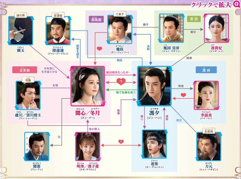 冬月/聞心役を演じるのは、ドラマ「ミーユエ 王朝を照らす月」に出演したスン・イー(孫怡)さん、馮夕役を演じるのは、ドラマ「王女未央-BIOU-」に出演したジン・ハン(金瀚)さんです。